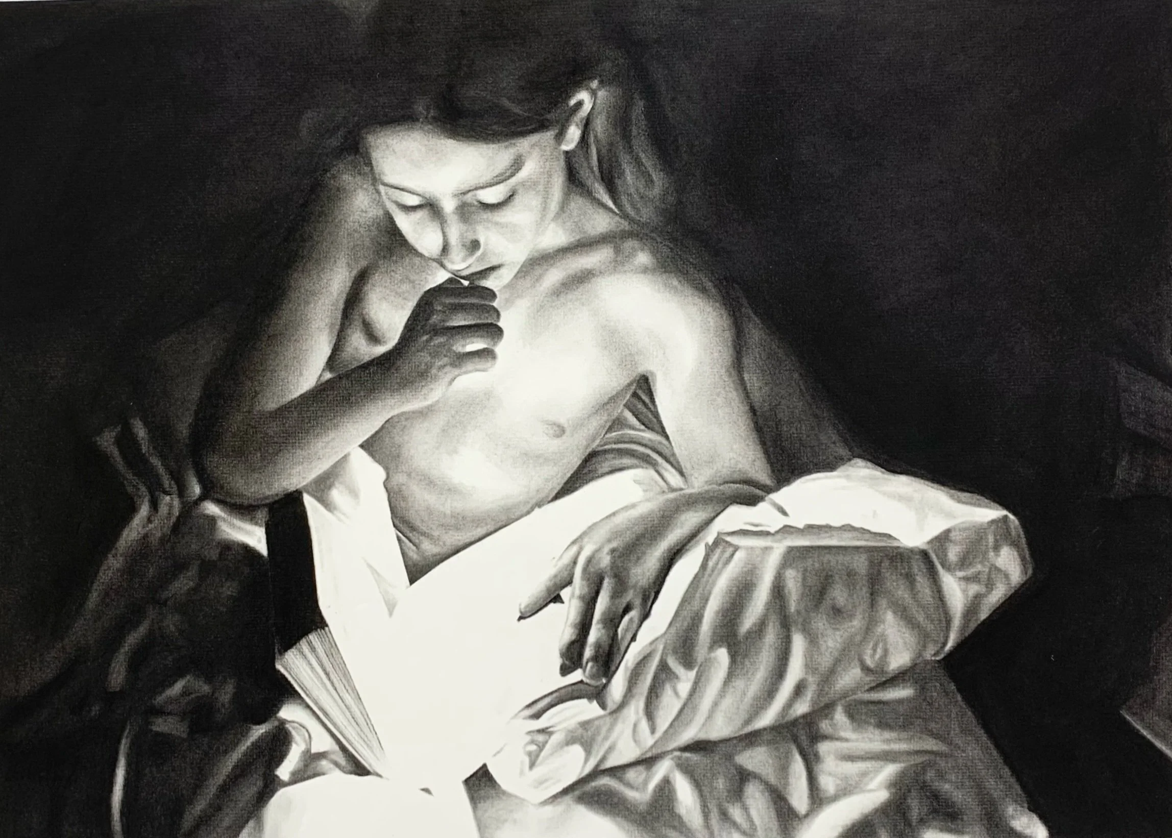 A young girl lies reading in the dark with a (hidden) flashlight in hand so as not to bother those sleeping across the room. The light illuminates her in such a way that the book’s pages wash out, her face and chest are highlighted, and the comfort of the bedding and her surroundings fade out to black. The bedding’s forms become ambiguous and figurative as the darkness creeps in around her.
