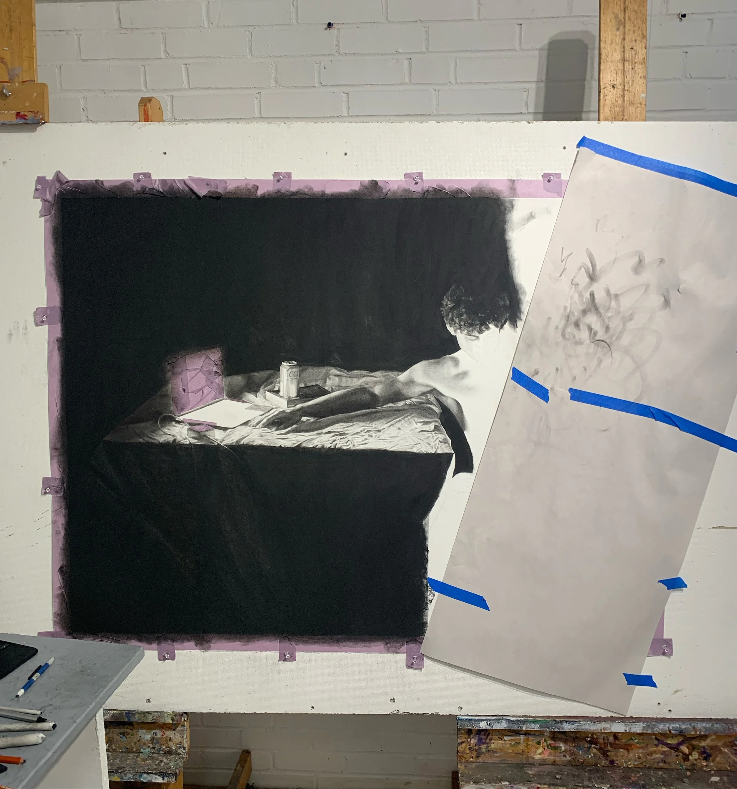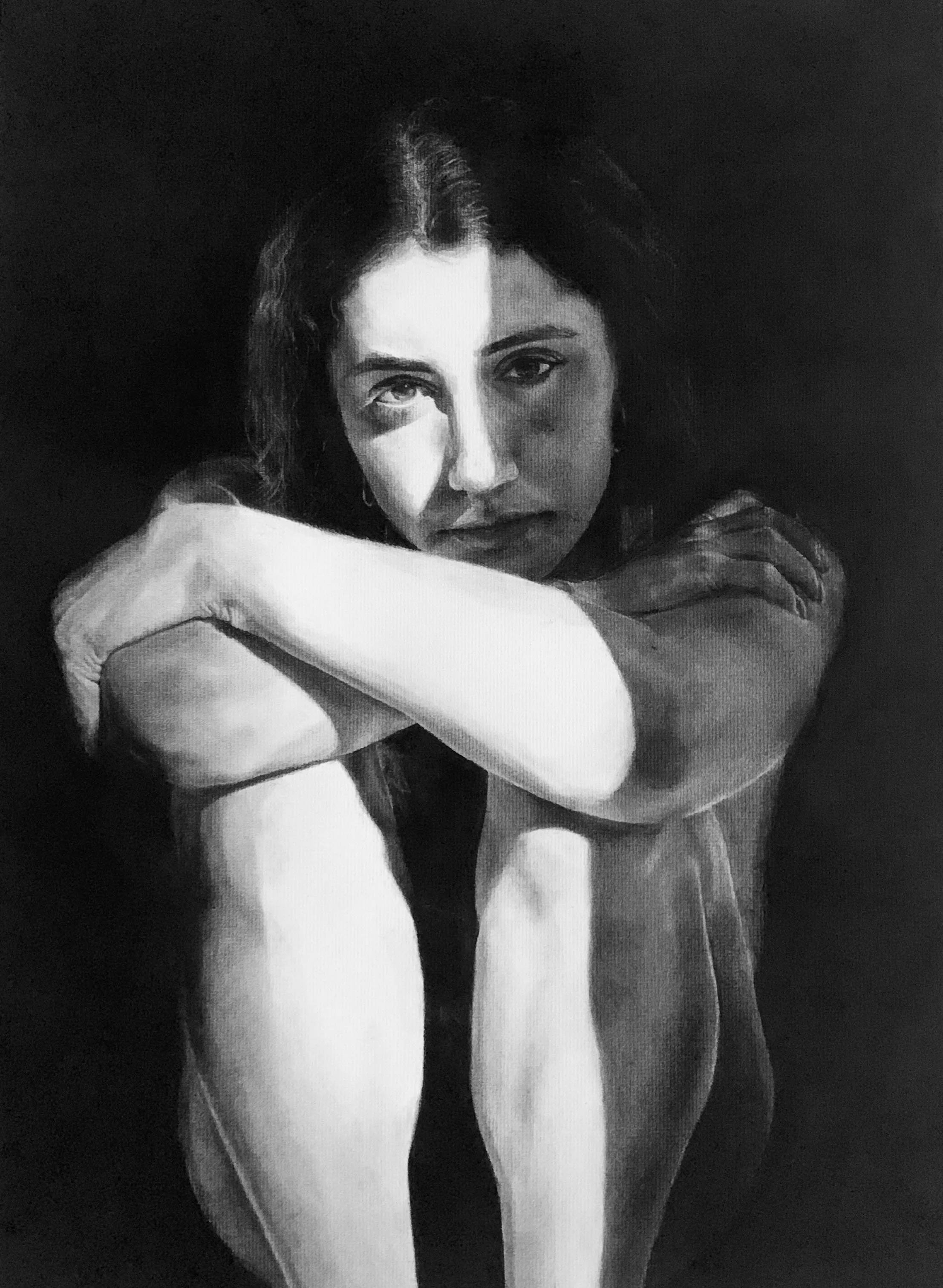 A modern take on Caravaggio’s “Saint Jerome in His Study” painting, this work foregrounds the interplay between the loudness and the silence that defined 2021’s worldwide pandemic and the increased weight of social media. The subject of this drawing sits alone in the dark, illuminated by and preoccupied with two screens. After encountering Caravaggio’s work while studying in Rome, his eye for chiaroscuro and high-contrast lighting began to work its way into my pieces. Like this charcoal work, I aim to call upon the passions I have for Classical Studies and Visual Arts to execute contemporary visions.